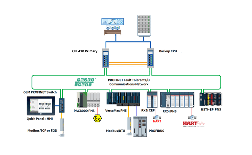 CPL410 wyposażony jest w 3 niezależne interfejsy Gigabit Ethernet i obsługuje przemysłowe standardy komunikacji, takie jak: Profinet IO, OPC-UA, Modbus TCP, SRTP oraz EGD. Komunikację na poziomie procesowym OT uzupełnia komunikacja na poziomie sieci IT, która pozwala podłączyć CPL410 do zewnętrznej sieci Internet w oparciu o czwarty, niezależny interfejs komunikacyjny Gigabit Ethernet.